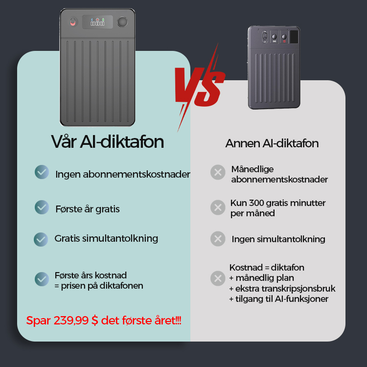 Ingen ekstra kostnader, ingen abonnement- eller medlemsavgifter. Ubegrenset transkripsjonstid, ubegrenset AI-bruk.