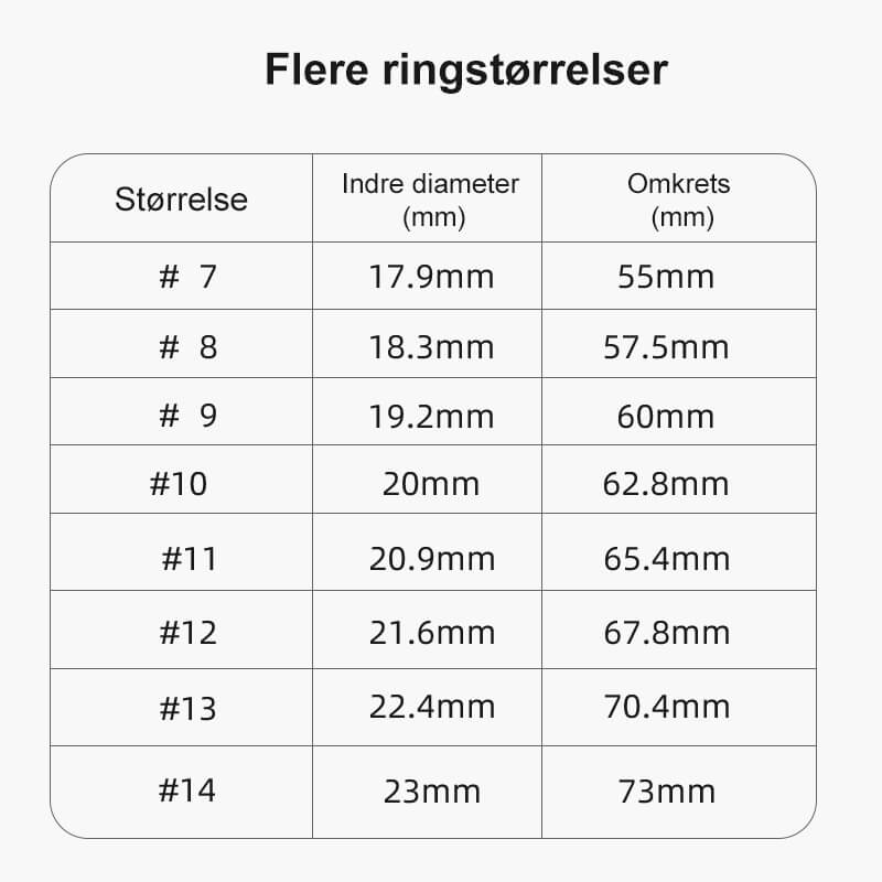 Stram tauet når du måler. Vi tilbyr en praktisk byttetjeneste for ringstørrelse. Hvis du mottar en ring som ikke passer, vil vi bytte den til en ny ring med riktig størrelse.